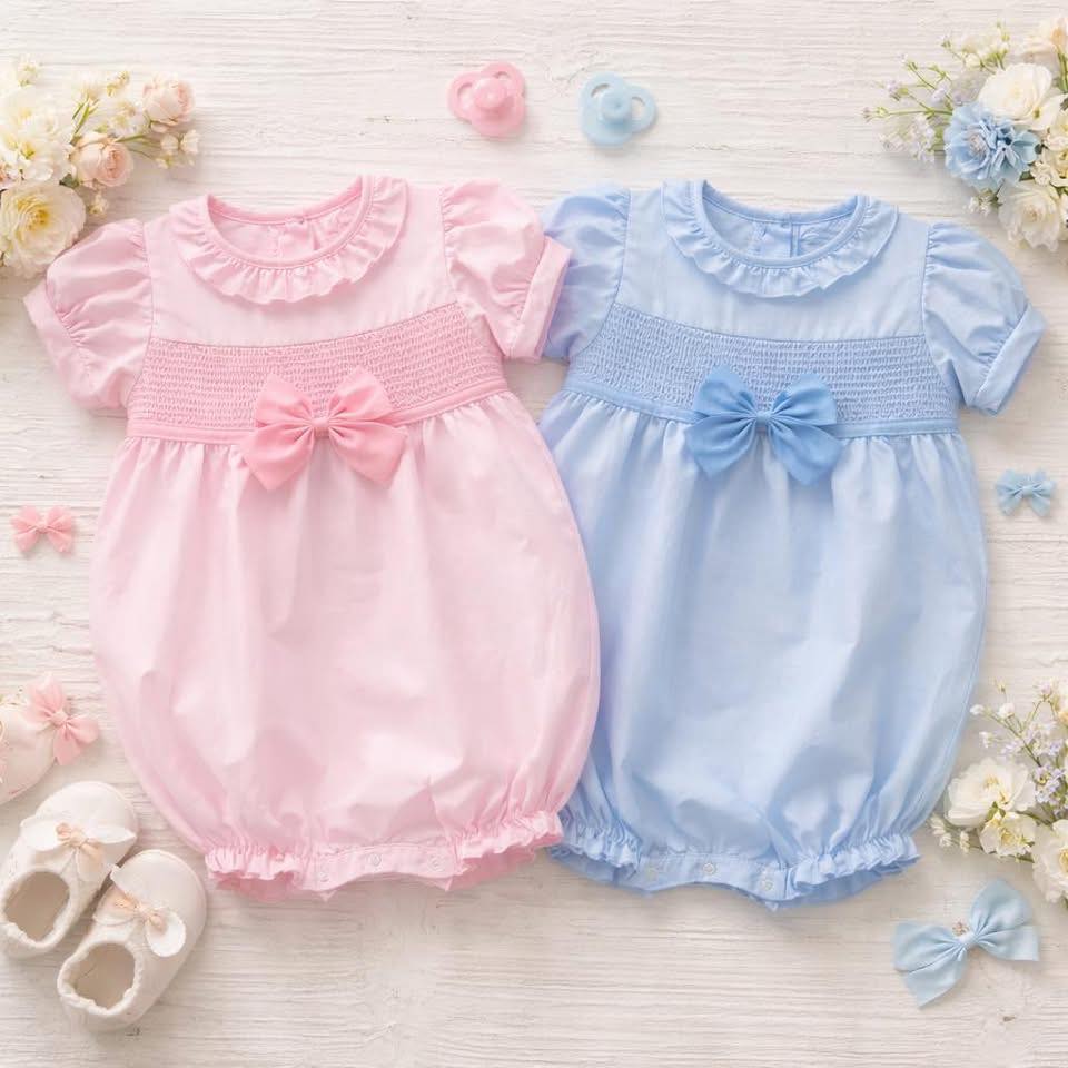 Adorable one-piece romper designed for baby girls, featuring a charming bow detail and delicate frill collar. Available in soft pink or baby blue, this playful piece combines comfort with style for special occasions or everyday wear. Perfect for creating precious memories in photos or playdates.