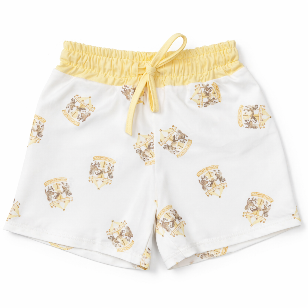 Make a splash this season with our vibrant Carousel Swim Shorts, featuring a playful carousel print that brings joy to every poolside moment. Crafted for comfort and style, these shorts offer a relaxed fit perfect for swimming and lounging. Note: This style runs small—we recommend sizing up one size for the best fit. Available in cheerful lemon tones with eye-catching carousel detailing, they're an essential addition to your summer wardrobe.