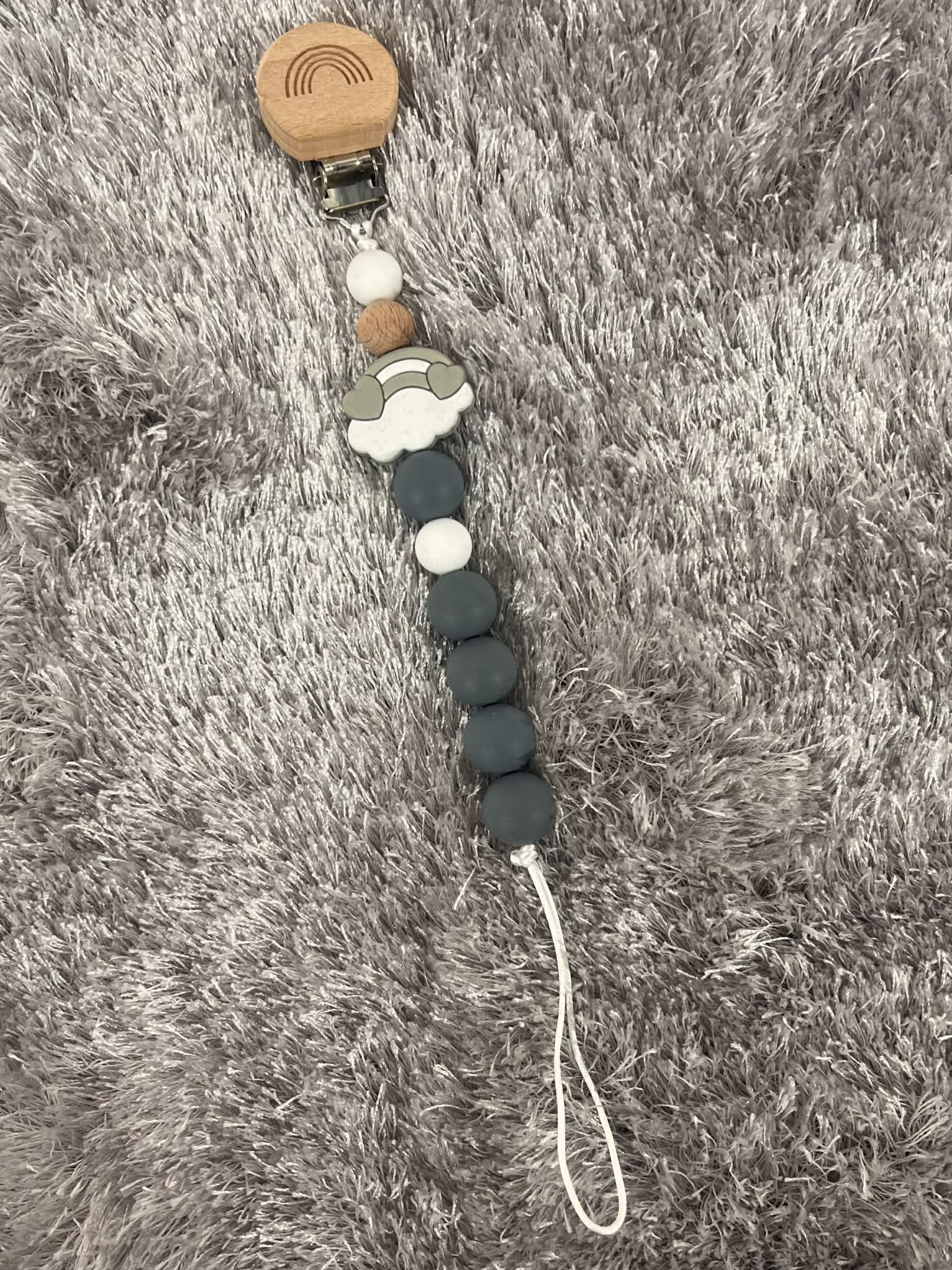 Keep your little one's dummy close at hand with this charming Rainbow Dummy Clip. Featuring a silicone design in vibrant cloud hues, it's paired with a natural wooden connector that's gentle on developing teeth. The sturdy teether strap keeps dummies secure and within reach, whether you're out and about or at home. Safe, stylish, and practical—the perfect accessory for busy parents and curious babies.