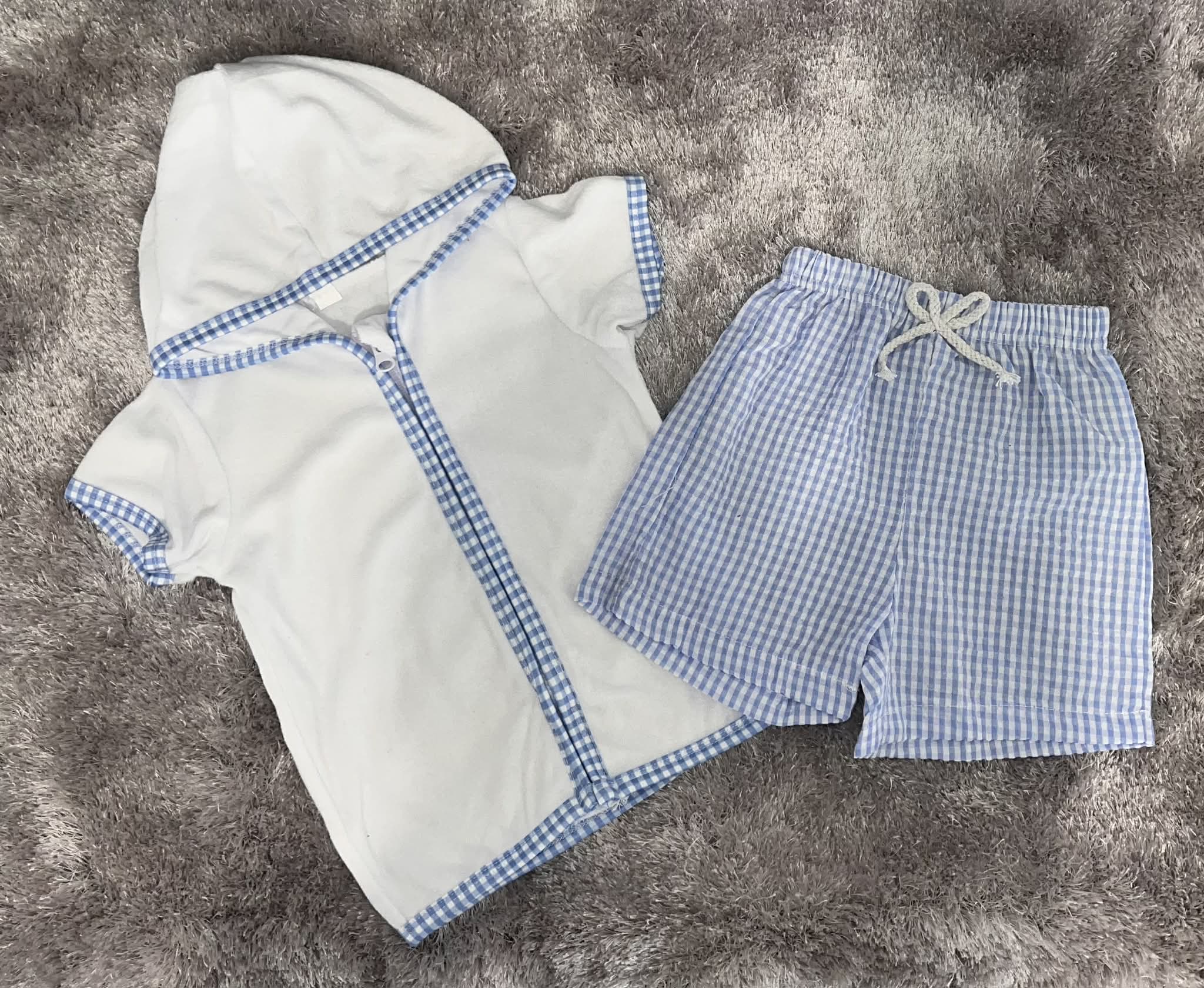 Make a splash this season with our cheerful Gingham Swim Set! Featuring vibrant gingham shorts paired with a cosy towelling jacket, this dynamic duo is designed for little adventurers heading to the beach or pool. The soft towelling layer keeps him warm and dry between swims, while the classic gingham pattern adds a timeless touch to holiday snaps. Perfect for creating summer memories, this set combines comfort with style for endless seaside fun.