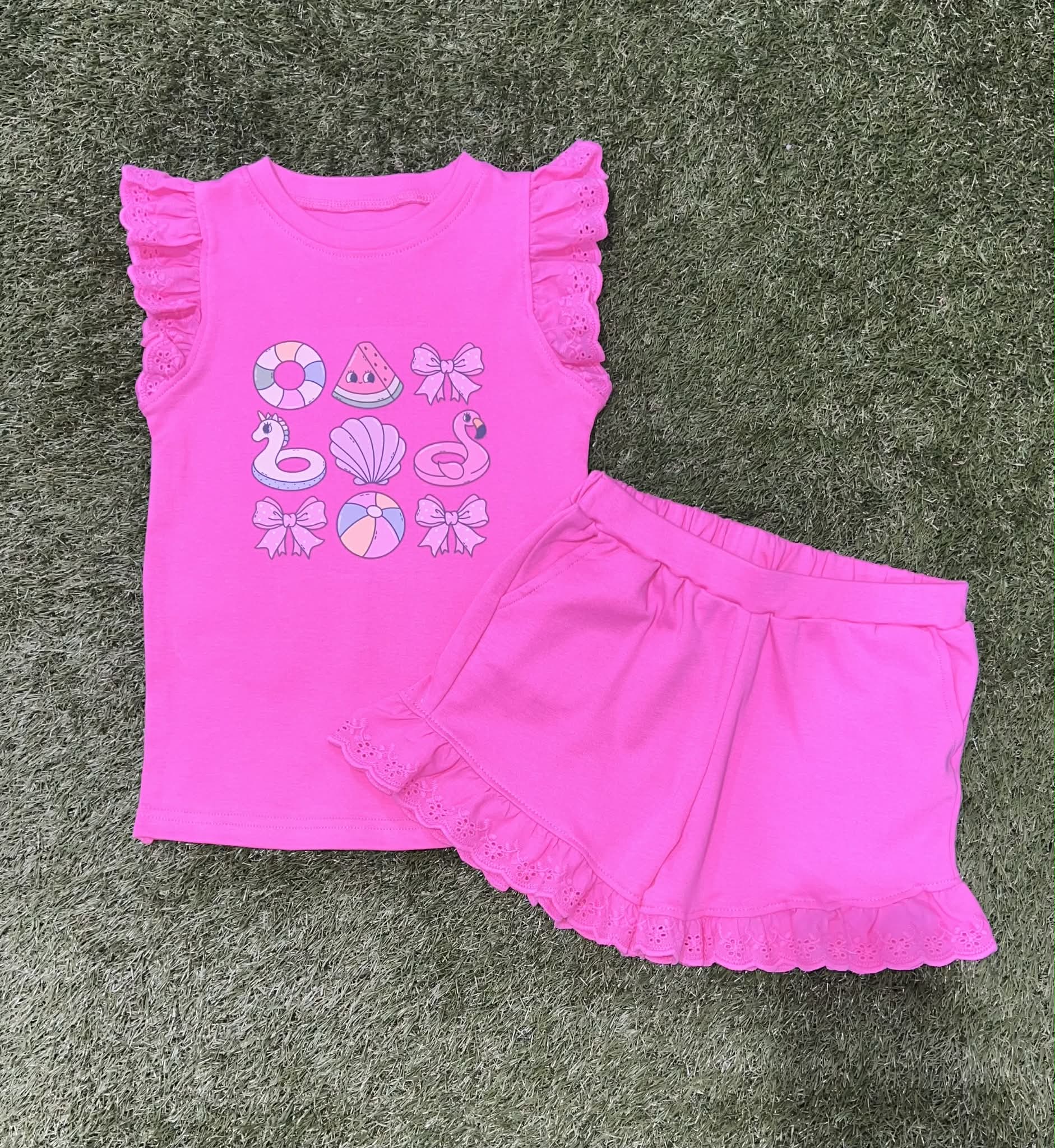 Beat the heat in style with our floaties Short Set, featuring a cheerful fuchsia palette and adorable floatie design. Perfect for those lazy summer days by the pool or beach, this playful two-piece keeps you cool and comfortable while looking absolutely fab. The soft, breathable fabric and fun print make it an instant favourite for warm-weather adventures. Whether you're lounging at home or heading out for some sun-soaked fun, this set brings the perfect splash of summer joy to your wardrobe.