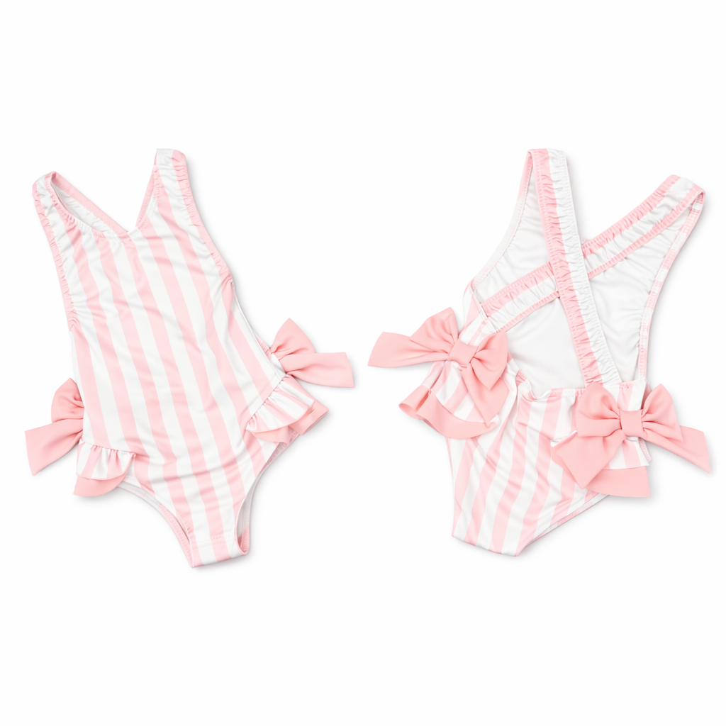 Charm meets comfort in this delightful pink striped swimsuit, adorned with a sweet bow detail that adds a touch of elegance to poolside moments. The soft stripes create a flattering silhouette perfect for water play and sunny days. Important: this style runs small, so we suggest selecting one size larger for the best comfort and fit. An adorable choice for those who love feminine details and classic seaside style.